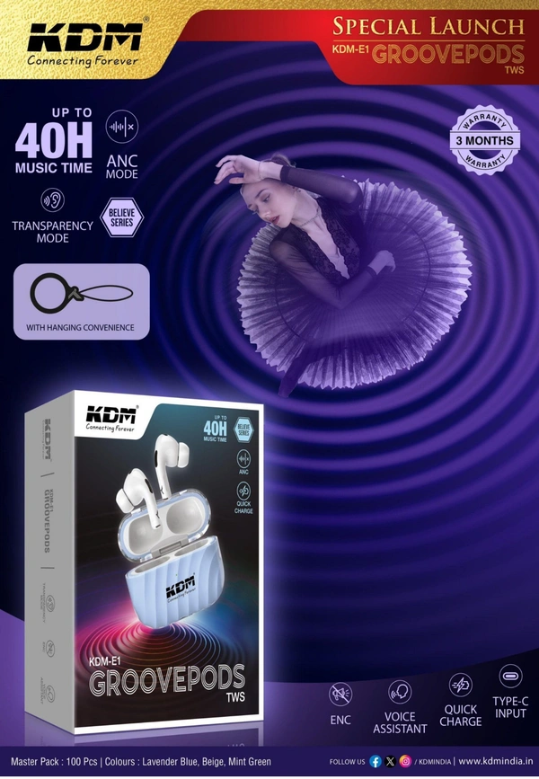 KDM-E1 GROOVEPODS TWS - Premium Wireless Earbuds with ANC & 40H Battery Life